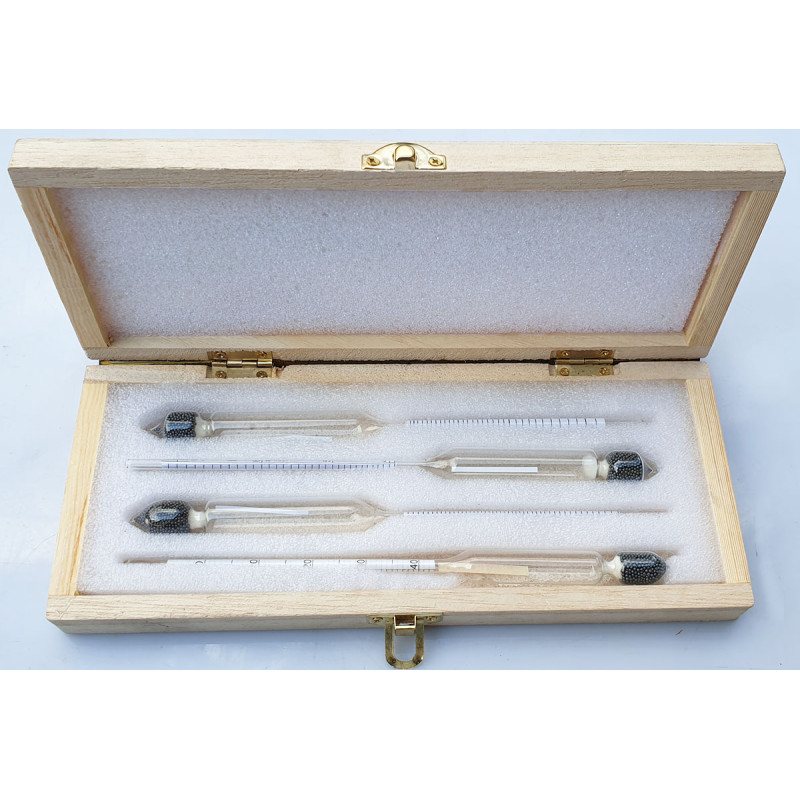 Zestaw umieszczony w drewnianym opakowaniu, bardzo funkcjonalny sposób na bezpieczne przechowywanie alkoholomierzy. W 1 zestawie , otrzymujemy alkoholomierze 0-100 %r.
