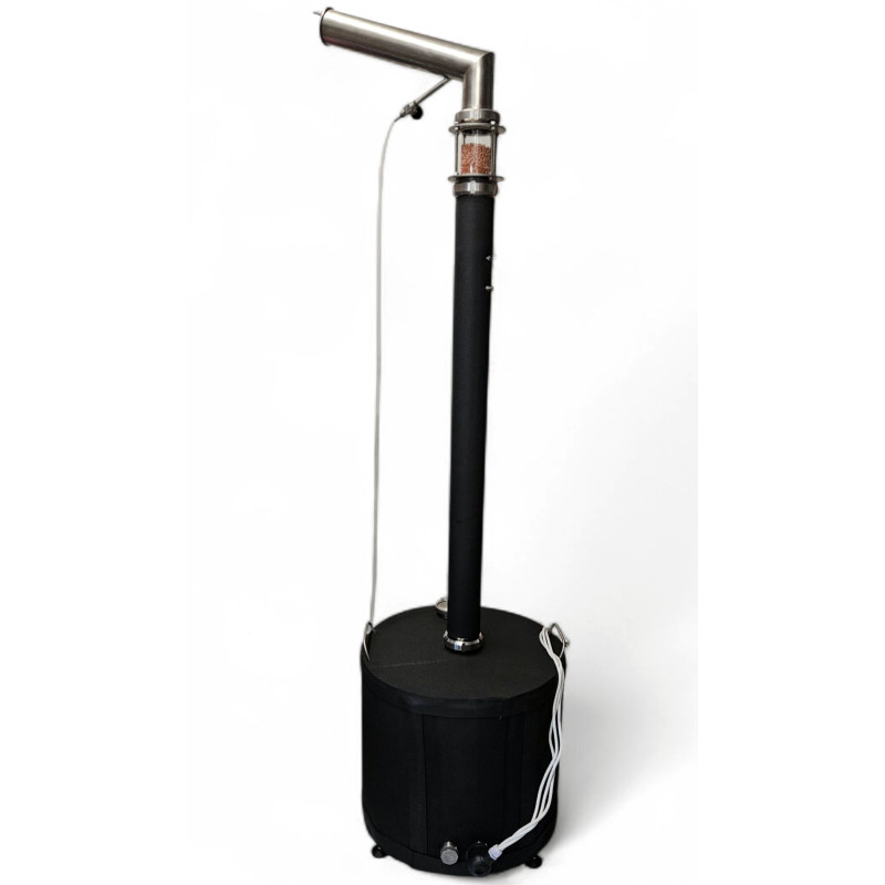 Destylator elektryczny typu aabratek na rurze 76 mm nierdzewnej gatunku 304, spawana metodą Tig, trawiona zanurzeniowo. Zestaw ze zbiornikiem 110 litrów w spawaną półmufą na grzałkę. Destylator przeznaczony do sterowania grzałką nierdzewną podwójną 1400/2000W, która dostępna jst na naszych aukcjach.