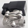 Elektrozawór nierdzewny kwasoodporny, zawór posiada 2 gwinty wewnętrzne 3/4 cala. Zawór posiada również cewkę oraz konektor do podłączenia zasilania.